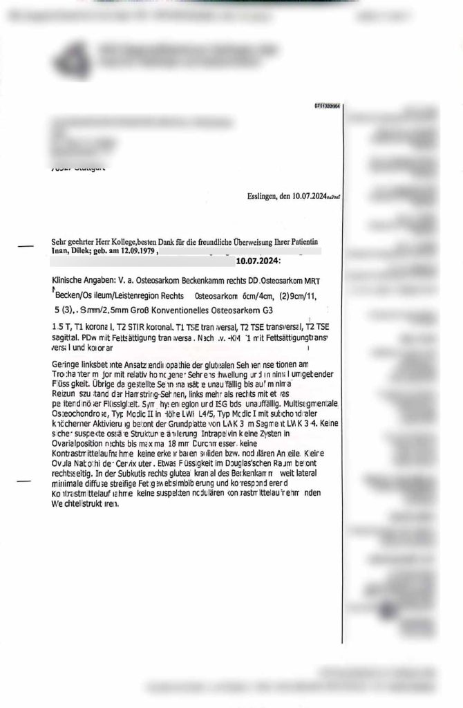 (G3 evresinde, agresif hücre yapısına sahip osteosarkom tanısı bulunan hastanın takibi üniversitemiz Onkoloji ve Hematoloji bölümü tarafından rutin kontroller kapsamında yapılmıştır. Yapılan hücresel ve ileri görüntüleme yöntemleri ile, tümörün aktif varlığına dair kesin bir bulguya ulaşılamadığı görülmüştür.