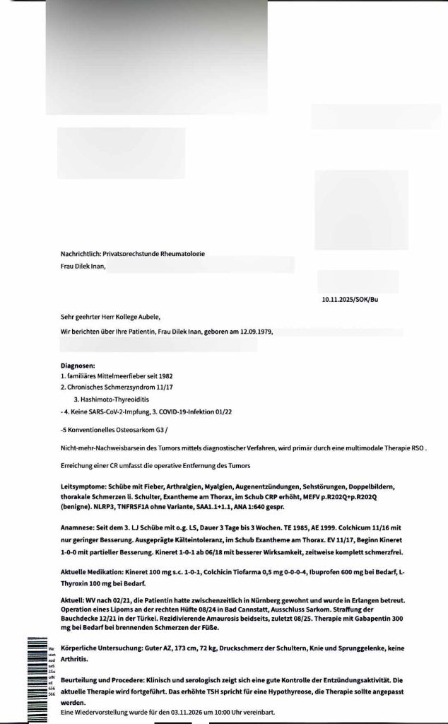 Hastanın eşlik eden genetik hastalığı olan FMF nedeniyle gerekli tedavi ve düzenli kontroller tarafımızca sürdürülmektedir. Mevcut genetik rahatsızlığına yönelik tedavi süreci devam etmektedir.)
